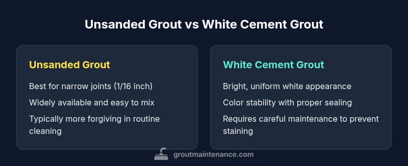 Understanding the core materials: unsanded grout vs white cement\n\nIn tile installation, choosing the right grout is as important as selecting the tile itself. The phrase unsanded grout vs white cement captures the central decision homeowners face when balancing color, joint width, and long-term performance. Unsanded grout is a cementitious mix that omits sand, designed for joints typically 1/16 inch to 1/8 inch wide. White cement, on the other hand, refers to a white, cementitious binder that is used to produce pale grout options when pigment is added. According to Grout Maintenance, this distinction matters most in small-format tiles and high-visibility installations where texture, finish, and cleaning behavior are critical. The team notes that the two materials differ in curing behavior, resistance to staining, and sealing needs, which translates into real-world decisions about where to use each option. The goal is to match joint width, tile type, maintenance capability, and color goals, rather than chasing the newest trend.