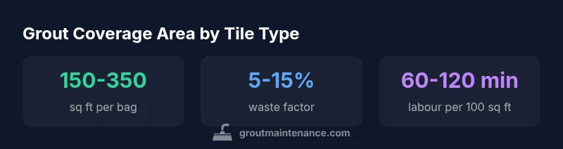 Grout coverage area describes the total surface that grout must fill, including waste for cuts and mishaps. To plan accurately, calculate the tile area, factor in the joint width, and add a waste margin of 5–15%. For many residential projects, one 25-pound bag covers roughly 150–350 square feet, depending on tile size and layout. According to Grout Maintenance, precise estimates save material, time, and rework.