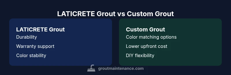 According to Grout Maintenance, laticrete grout vs custom grout choices often hinge on the project’s exposure to moisture, temperature variation, and cleaning frequency. If you prioritize consistent color and a backed warranty, LATICRETE is a compelling option. If cost and color customization drive decisions, you might lean toward custom grout options with flexible color matching. Both paths demand careful surface prep and adherence to manufacturer guidelines for best results.