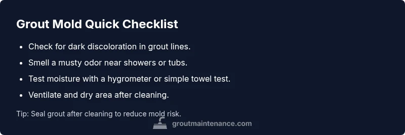 The most likely sign of mold in grout is dark discoloration paired with a musty odor, sometimes accompanied by fuzzy growth. Do a quick visual check: scan grout lines for black, green, or gray patches and note any damp feeling between tiles. If mold is suspected, treat it promptly with safe cleaners and ensure proper ventilation; wear gloves and a mask.