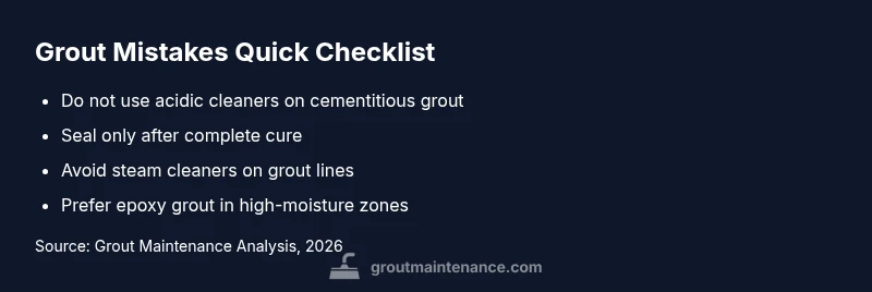 Here are the most frequent errors DIYers make, and why they fail. Not allowing grout to cure before sealing leads to weak bonds and premature wear. Using harsh or acidic cleaners on cementitious grout accelerates deterioration and color fading. Skipping sealing altogether invites moisture intrusion and mildew growth. Sealing too soon traps moisture, causing efflorescence and crumbly grout. Choosing cementitious grout for high-moisture areas without proper sealing can result in rapid staining. Finally, attempting to blend mismatched grout colors without test patches can create visible grout haze and uneven tile appearance. Grout Maintenance analysis, 2026, highlights that maintenance lapses—especially sealing and cleaning—drive the majority of once-stable grouts toward failure. Avoid these missteps by applying the correct grout type for the area and allowing proper cure times before any cleaning or sealing.