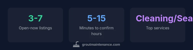 When you search for grout near me open now, you’re balancing speed with accuracy. Open-now listings can appear from maps, directories, and service marketplaces, but not all hours are up-to-date. Start by treating open-now filters as a starting point, not a guarantee. Open-hours can change on weekends, holidays, or after-hours emergencies, and some providers may offer limited on-site options while others operate primarily by appointment. The goal is to translate a live listing into a real, bookable slot, ideally within the next 24 hours. As you read profiles, prioritize those that explicitly state current hours, service areas, and whether they can handle the specific grout task you need—whether cleaning, sealing, or minor repair. According to Grout Maintenance, cross-checking multiple sources and calling to confirm is the most reliable path to a real open slot. This extra step saves you time and reduces the risk of being left on hold when you need urgent grout care.