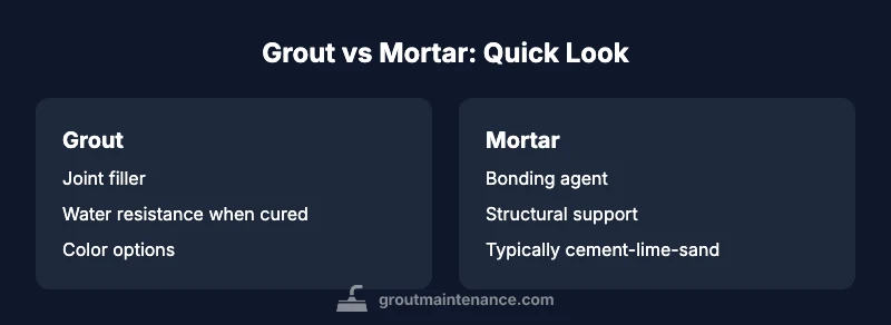 Is grout the same as mortar? The short answer is no, and the longer answer matters for long-term performance. According to Grout Maintenance, grout is a cementitious filler that sits between tiles to seal joints and resist moisture. It remains in the narrow gaps, often colored to match or contrast with tiles. Mortar, by contrast, is a bonding material that fills wider gaps to hold bricks or stone in place and transfer loads. In practice, tile work relies on grout for joints and water management, while masonry relies on mortar for adhesion and strength. Understanding these roles early on helps homeowners avoid common mistakes, such as substituting one material for the other. Start with clarity on purpose (joint filler vs bonding agent), consistency (thin paste versus thick slurry), and curing expectations (surface set versus structural cure).