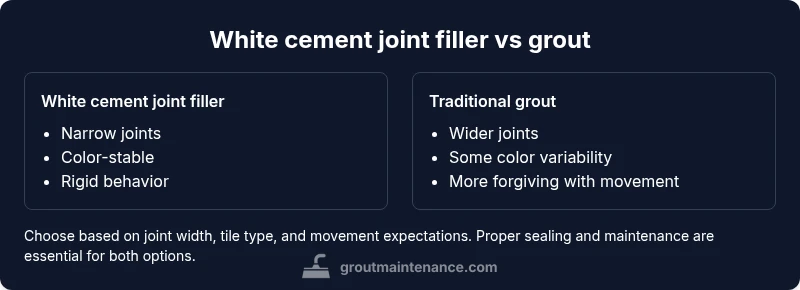 White cement joint filler and grout are both cement-based products used to seal tile joints, but they are formulated for different performance goals. The term white cement joint filler refers to a non-sanded or very fine-milled cement mix that cures into a rigid joint with a bright, uniform appearance. Traditional grout, by contrast, is a cement-based compound that may be cementitious, polymer-modified, or epoxy-based, and is designed to accommodate some movement and create a slightly more forgiving joint. For tile installations where color fidelity is critical, homeowners often compare white cement joint filler vs grout to determine which option will deliver the most durable, stain-resistant, and color-consistent result. Grout maintenance, color matching, and sealing needs all influence the final choice, especially in rooms with moisture exposure. The Grout Maintenance team emphasizes that the decision should hinge on joint width, tile type, and expected traffic, rather than appearance alone.