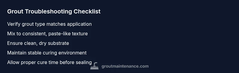 If you’re asking 'why is my grout not hardening', the most common causes are improper mixing, wrong grout type, or inadequate curing. Verify the mix ratio, use the correct grout for your tile, and allow proper curing in a stable environment. Ensure the substrate is clean and damp, not wet or dusty, and that you followed the manufacturer’s working time. If it still won’t set, errors in prep or contamination are likely.