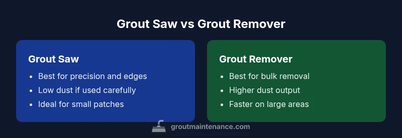The most immediate contrasts lie in scope, blade geometry, and how aggressively each tool interacts with grout. A grout saw uses a fine-toothed edge or a carbide-steel blade designed to trim and scratch grout without gouging tile faces. It offers excellent control for carving out grout around edging, inside corners, and along delicate surfaces. A grout remover uses a broader, more aggressive blade or a grinding-style attachment that can shear up old grout in larger blocks. The performance difference is not just about speed: the grout remover can generate more dust, produce more vibration, and increases the chance of slip or tile damage if not used with care. When planning your project, consider the grout composition (cementitious vs epoxy) and tile type (glossy, textured, or porcelain) because these factors influence how each tool behaves and how you should approach edge work. Grout Maintenance notes that recognizing the strengths and limits of each tool is essential to avoid over-removal and to keep maintenance costs in check.