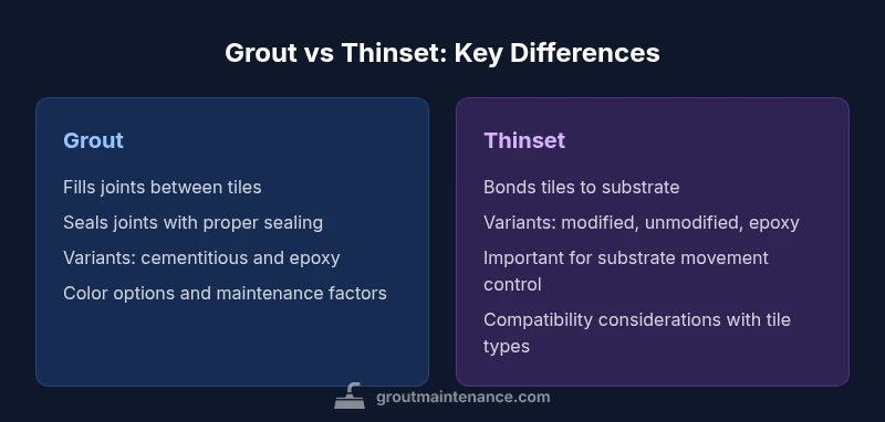 Grout and thinset are fundamental materials in tile installations. Grout is used to fill the joints between tiles, while thinset is the adhesive mortar that bonds tiles to the substrate. This article presents an analytical comparison to help homeowners understand how these products affect durability, moisture resistance, and maintenance. According to Grout Maintenance, the success of a tiling project hinges on selecting the right thinset type for the tile and substrate, and pairing it with an appropriate grout formulation. The Grout Maintenance Team emphasizes considering substrate movement, tile material, and environmental exposure when making choices. By walking through material properties, installation steps, and care routines, we provide a decision framework you can apply to kitchens, bathrooms, and outdoor spaces. Throughout, the focus is on practical guidance supported by industry best practices, not marketing claims. We will unpack cementitious versus epoxy grout, cementitious versus modified thinset, and how sealing strategies influence long term results.