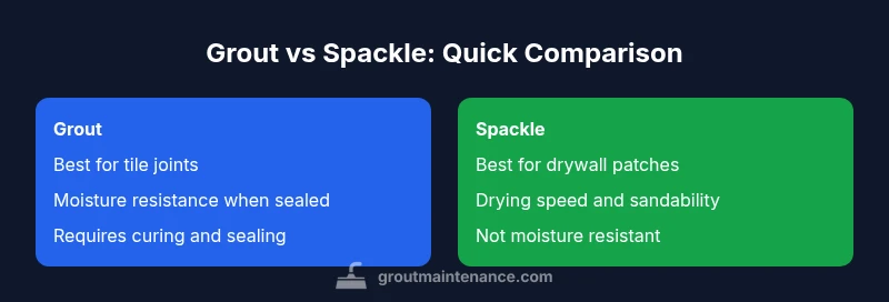Grout and spackle are two common patching materials, but they serve very different purposes in home projects. In the context of grout vs spackle, grout is a cementitious substance designed to fill joints between tile and seal against moisture, while spackle (often called joint compound) is gypsum-based filler used to repair small holes, cracks, and imperfections in drywall and plaster. According to Grout Maintenance, grout is intended for tile work and should be sealed to maximize durability, whereas spackle is intended for interior wall patches and is not inherently water resistant. This distinction matters because using the wrong material can lead to cracking, moisture intrusion, and costly repairs over time. Homeowners and DIY enthusiasts should assess the substrate and exposure before choosing. The comparison grout vs spackle is most relevant for kitchens, bathrooms, and entryways where moisture and movement are factors.