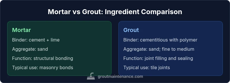 Understanding mortar vs grout ingredients is essential for tile and masonry projects. The terms mortar ingredients and grout ingredients can be confusing, but they describe two distinct materials with different roles in construction. According to Grout Maintenance, choosing the right combination saves time, reduces maintenance, and improves long-term performance on walls and floors. In practical terms, mortar provides the structural base that bonds masonry units, while grout fills and seals joints between tiles. The goal is to minimize future cracking, reduce water ingress, and extend the life of the installation. This section introduces the topic and sets up a clear, practical comparison for DIY enthusiasts and homeowners.