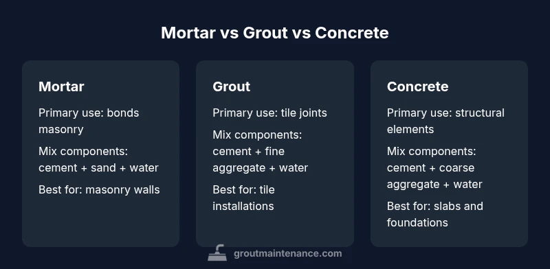 Explore the differences, uses, and installation tips for mortar, grout, and concrete. This objective comparison covers suitability for tiling, masonry, and slabs, with practical guidance for homeowners and DIY enthusiasts from the Grout Maintenance team.